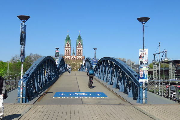 "Hinterm Bahnhof" liegt der Stadtteil Stühlinger. Die blaue Brücke mit Blick auf die Herz-Jesu-Kirche ist das Wahrzeichen des Stadtteils. Hier finden Sie neben der Uniklinik u.a. das technische Rathaus.